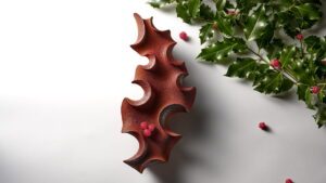 - Four Seasons Georges V: Michael Bartocetti’s holly-branch bûche features gianduja, pear, and tapioca mousse.