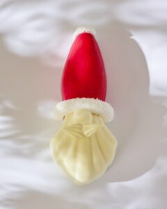 - Ritz Paris: François Perret presents a playful and indulgent Santa hat-inspired bûche, featuring spiced coconut biscuit, light mousse, tangy mango-passion-lime compote, and coconut shavings.